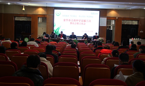 会上,蔡洪伟校长作题为《星光不负赶路人 江河眷顾奋楫者》的学校工作报告和《金华市江南中学三年发展规划》解读报告。蔡校长回顾了2021年学校工作,列举了取得的成绩,指出了存在的问题,以前瞻的眼光分析了学校教学改革发展面临的形势与挑战,提出了学校未来工作的总体思路。他提出,进一步完善办学体系;进一步完善课程体系;进一步打造德育特色;进一步深化教学改革,形成学校品牌的工作目标。他指出,全面提升教育教学质量,擦亮学校教育品牌,全面构建“小组合作制”为基础的教育体系,再谱江南教育新篇章。