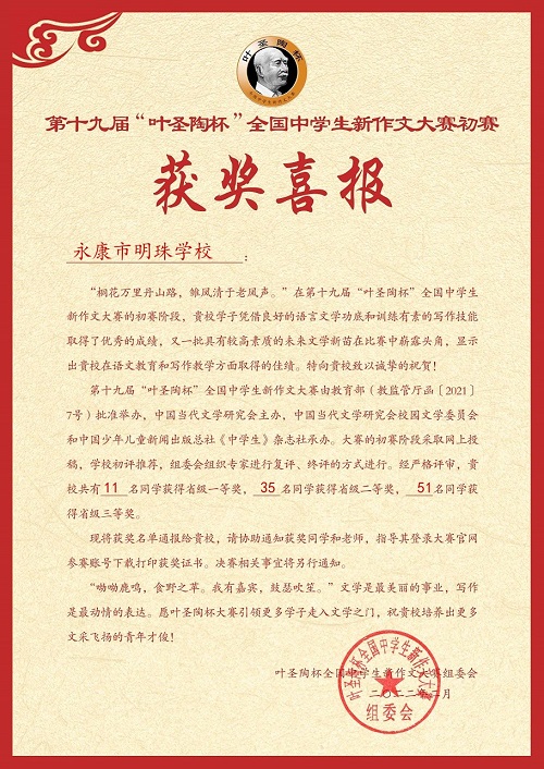 本次大赛永康市明珠学校取得如此佳绩,这与该校长期重视语文阅读与写作,注重学生人文素养的提升,语文老师对学生写作兴趣及写作能力的培养密切相关。本次大赛,参赛同学书写理想,展现风采,这必将成为他们人生中一次难忘的经历。在以后的教学中,永康市明珠学校将继续倾心培养学生,为提高中学生语文核心素养、立德树人、五育并举做出应有的贡献。