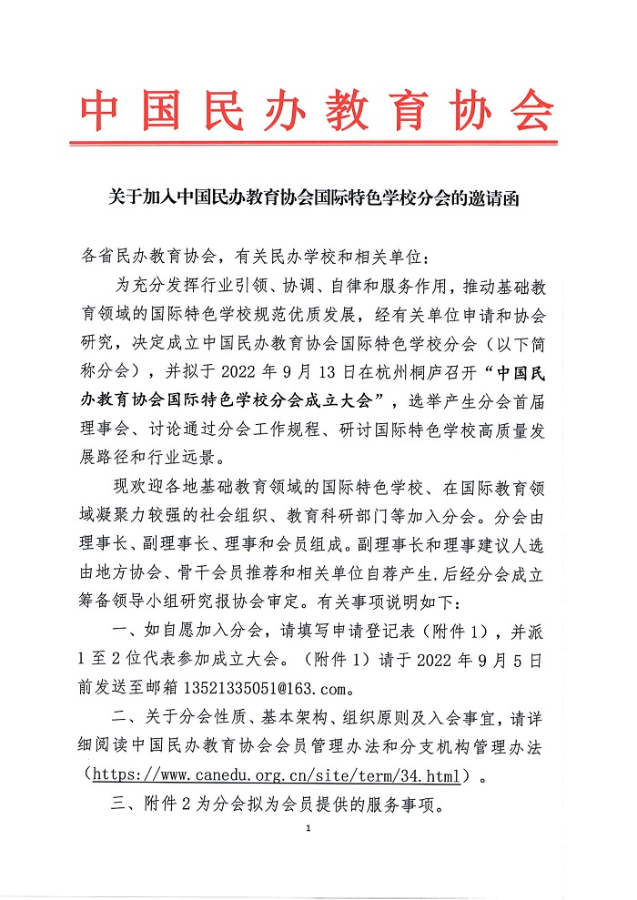关于邀请加入中国民办教育协会国际特色学校分会的函(图)