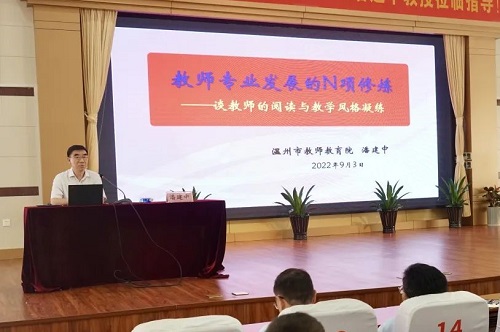 2022年9月3日下午,瑞安龙翔高级中学邀请浙江省特级教师、名校长、原温州市教师教育院院长潘建中教授为学校全体教师开展主题为“教师专业发展的N项修炼——谈教师的阅读与教学风格凝练”的讲座。