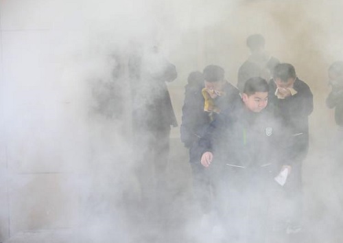 学生在老师的指挥下,用湿毛巾捂着口鼻,弯着腰有序地从教室里出来,按指定路线迅速、有序疏散“逃生”,快速来到教学楼前面的五环广场集中。