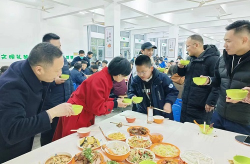 晚饭时间,学校精心准备的丰盛年夜饭早已摆好,不仅有平日就“人气极高”的糖醋里脊、巨无霸肉串……还有极具浙江特色的年菜,三鲜、白斩鸡等。同学们在欢声笑语中落座,与校长、老师们共同举杯,展望新岁。