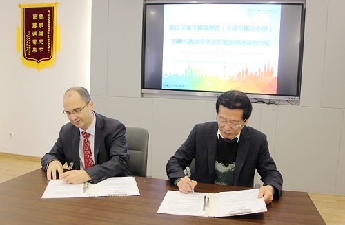 义乌外国语学校杨卫平董事长与加拿大皇冠中学AJ副校长本着“平等、友好、互惠、互利”的原则,签订国际友好姐妹学校合作协议。(钟乐平 蒋志慧)