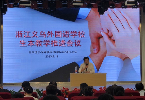 “必须组织有效的教研,促使老师养成二次备课的习惯。第一次备教材,以集体备课为主,指导学生有效预习;基于学情进行第二次备课,导出最佳问题,设置解决问题的路线图,成为不是来自老师主观而是来自学生客观的好的教学设计,这样的课堂就不会‘胸中有书,目中无生’,而是高效率的学生主动参与其中的好课堂”4月21日晚上,义乌外国语学校董事长、校长杨卫平先生在生本教学推进会上,面对全校近200名老师作了“让课堂成为学校最美的风景”的主题讲话。