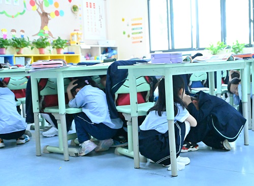 学生们听到警报声后,在老师的指挥下迅速抱头蹲下、闭眼,躲在各自的课桌下,尽量蜷曲身体,降低中心,并保护住头部。