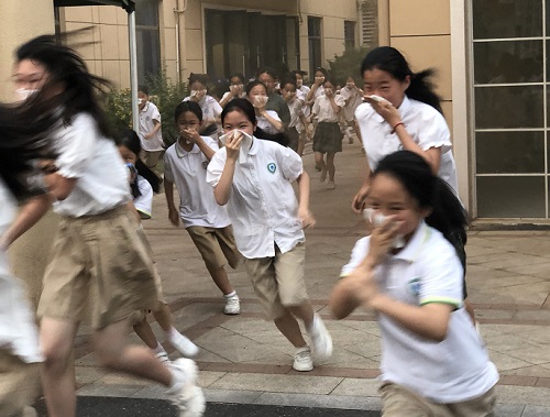 各岗位老师迅速到达指定岗位,班主任、生活老师从容组织学生快速疏散。1600余名住校学生用湿毛巾捂住口鼻,弯着腰、扶着墙,沿着教学楼、宿舍楼梯口快速前进,撤离到操场安全区域,整队后班主任立即清点人数并向总指挥汇报。从教室撤离到安全区域,共费时4分钟。