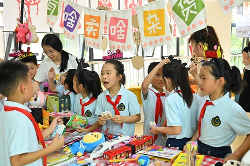 “走过路过不要错过”、“全场清仓大甩卖”、“买到就是赚到”……一个个小老板,全情投入,招揽生意,摊位前小顾客们自然也是络绎不绝。一时间,吆喝声、讲价声、欢笑声,充满校园。荣宝们也在这场公平自由的买卖中,体验着交换与劳动的快乐。