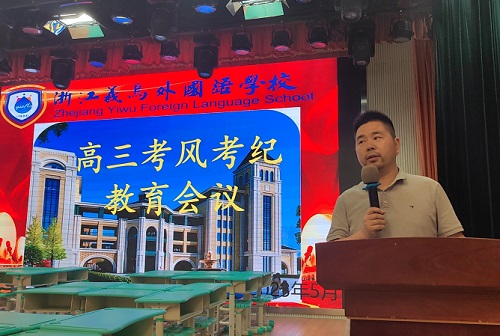 “除了必要的文具用品外,其他任何物品不得带进试场。特别提醒:考生违规携带手机等通讯工具进入考场,将按《国家教育考试违规处理办法》的有关规定处理,其所报名参加考试的各阶段、各科成绩无效”6月5日晚上18:30,义乌外国语学校学生剧院里,高中部楼大海主任在高三考风考纪教育会上,面对160余位即将参加高考的学生严肃提醒,对所有参加2023年高考的学生提出了殷切的希望。