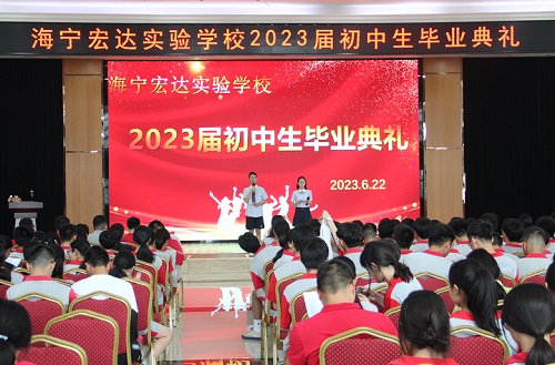 6月22日下午,海宁宏达实验学校九年级全体师生齐聚在学校报告厅,隆重举行2023届初中毕业典礼。宏达学校校长吴育忠、常务副校长笪儒忠、副校长施大千、戴建诚、徐再飞等学校领导出席了毕业典礼。大会由九(3)班贺嘉怡、九(4)班胡乐其同学主持。