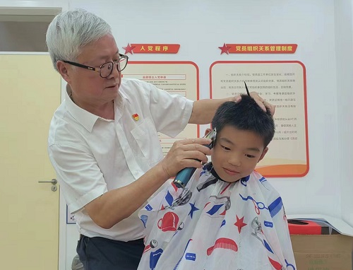 “坐好咯,今天校长爷爷给你理一个最帅的发型!”徐校长说完,便拿出理发工具,细致耐心地为孩子们理发。俯首、半蹲,一剪一推间尽显宠爱。“小顾客”李梓铨兴奋地说:“这是校长爷爷第二次给我理发,我的心中满是欣喜之情和崇拜之意!”张毅轩也激动地说:“今天,我就是荣光学校最靓的男孩!”