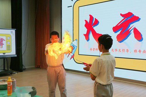 小学505班叶昊同学与501班陈辰同学把“火云掌”带入科学课堂。水盆里加洗洁精,压入气罐,手浸湿,捞起一团泡沫,点燃,霎那间“熊熊大火”于手心燃起,“火云掌”精彩呈现。他们专业的操作赢得现场阵阵掌声。