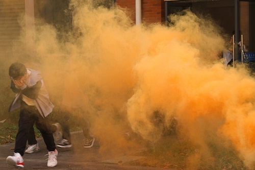 演练开始,校园里浓烟四起,急促的警铃声响彻整个校园。学生宿舍各楼层负责老师迅速到位,指导学生快速疏散。各班学生在老师的带领下,俯身低头,用湿毛巾衣物捂住口鼻,沿着安全出口指示标识快速前进。整个演练过程中,参演人员的行动迅速有序,全部安全撤离。