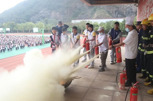 在消防宣传人员为大家演示了灭火器的使用方法后,他们请到后勤、生活老师、教师、学生等几位代表上来现场使用灭火器,每位代表根据黄教官所传授的四字灭火器使用法,均正确地利用灭火器扑灭了现场的演示火焰。