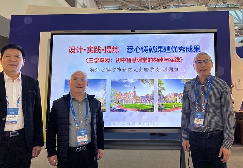 在博览会期间,瑞安市新纪元实验学校的教研成果《三学联网:初中智慧课堂的构建与实践》受到关注,并有机会与参会者进行面对面的交流。据悉,学校从2006年开始提出“以自学为主的课堂教学法”,到2009年形成具有教学普遍意义且可操作的“自学—交流—总结”的课堂教学体系,又到2012年进而升格为“自学—议学—悟学”的“三学循环”课堂教学模式,再到2018年“互联网+”背景下创生提出“三学联网”智慧课堂教学模式,并获评温州市2020年教育科学研究优秀成果奖,进而于2020年《三学联网:初中智慧课堂的构建与实践》申报立项浙江省教科规划课题研究,2023年1月叶绍胜总校长领衔的课题《三学联网:初中智慧课堂的构建与实践》研究获评浙江省2021年度教育科学研究优秀成果一等奖。会上,学校以《设计·实践·提炼:悉心铸就课题优秀成果》为题,分“课题研究的设计迭代、课题研究的实践样态、课题研究的成果提炼、课题成果的应用转化”四个部分向来自全国的教育专家与老师们分享与交流,经过3年的精心打磨与提炼,学校在“学生自主学、教师有效教、技术精准辅”等方面取得了显著的研究成果:优化了预学案、议学案、悟学案“三个学案”导学设计,打造了课前预学系统、课中互动系统、课后复习系统“三个技术”支持路径,创新了教学载体线、技术支持线聚焦学生学习线的“双线聚焦、三线一体”的学教模式,构建了可操作性的“三学四环”学教流程,研制了智慧课堂“三维评价”学教标准。通过研究与实践,优化了学教方式,培养了学生的高阶思维,初步实现了信息技术与教育教学的深度融合。师生获得了长足发展,学业成绩全面提升,学校赢得了良好的社会声誉。特别详细地介绍了“三学联网· 三线一体”的学教模式的实施框架、操作流程及教学过程,赢得了听众嘉宾的阵阵掌声,得到了专家与老师们的高度赞赏。