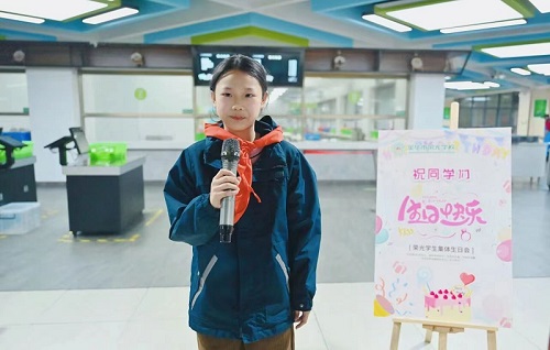 接着,学生代表上台发言。小代表感谢了校长的关怀和老师们的辛勤付出,同时也表达了对友谊的珍惜,对同庆生日的喜悦。他表示,在荣光这个大家庭里,生日不仅是个人的节日,更成了班级、学校的节日,感觉到无比幸福。