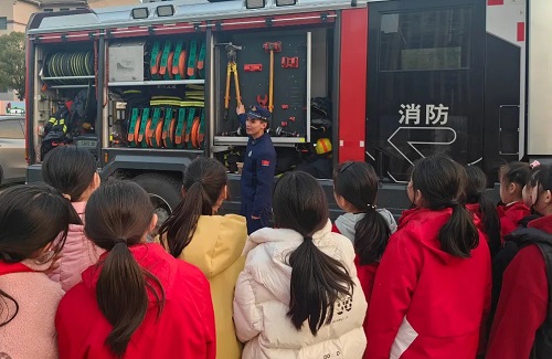 逃生演习结束后,师生们又认真聆听了消防知识讲座。郭焱副站长给大家讲解了相关安全知识和火灾突发的应对措施,带领学生参观了消防车,并详细介绍消防车随带的许多装备及功能,强调了加强安全自救能力的重要性。同时也对全体生活老师、值周教师进行了灭火器使用的强化培训。
