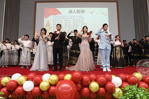 观礼之后,500多位家长为子女加冠,佩戴成人纪念章,以此宣告成人立事。304班华鑫宴的妈妈说:“儿子能够在成人之际,沉浸式体验冠礼的隆重,对孩子来说很有意义。”