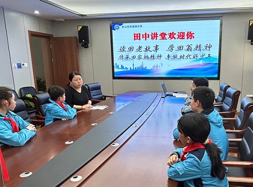 田家炳中学李陈红副校长、办公室李钟萍副主任热情地接待了他们。大家一起来到了科技楼前,瞻仰田先生的雕塑,着实感到了震撼。写实且肃穆的雕塑和感人至深的碑文无不昭示着田家的道德传承、家风醇厚,无不深深感动着每一个人。孩子们对田家炳先生的敬仰怀念之情油然而生。李副校长陪同宣讲中说到:田中仰仗厚重丰富的田中文化,守正创新、教书育人。一代代田中学子在这块沃土上健康快乐地成长,从这里开启新的人生征程。自强不息、敢于担当、奋发图强、严于律己、敦品力学、己立立人的“田翁精神”是田中校园文化的源泉和灵魂。紧接着,大家来到百年建筑“思刘堂”的会议室,进行了进一步的交流和探究。