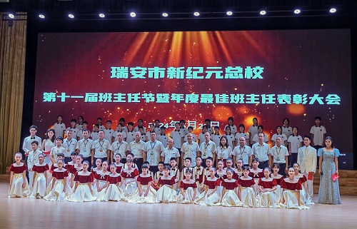 表彰会上,瑞安市新纪元总校党总支部书记陈成良宣读表彰文件。30位年度****班主任、34位年度****班主任提名奖获奖者上台接受表彰。总校领导们为荣获2023学年年度****班主任提名奖、2023学年年度****班主任的班主任们赠送鲜花、颁发荣誉证书。