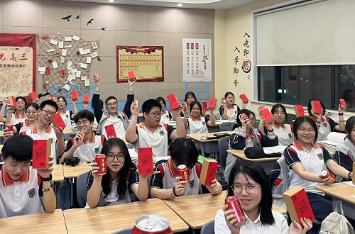 教室里各种造型摆放着的定胜糕和王老吉,也饱含着老师们的浓浓祝福。各班学生一手王老吉,一手定胜糕,齐声喊出了他们自己的心愿:感谢王老吉,大吉大利,“试试”顺利;吃了定胜糕,一定能成功!