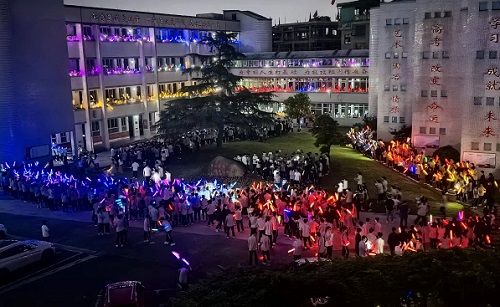 随着红日西沉,高一、高二的学生有序在教学区排好队伍,他们手持荧光棒,站在教学楼的各个楼层和中心花园四周,脸上洋溢着笑容,静静等待着活动的开始。“夜空中最亮的星,能否记起……”随着高一学生的一首快闪,教学楼灯光熄灭,高三的学生鱼贯而出,缓缓走到人群的中间。迎接他们的,是一千支荧光棒汇聚成的夜空中最亮的星,和学弟学妹们最暖心的祝福。
