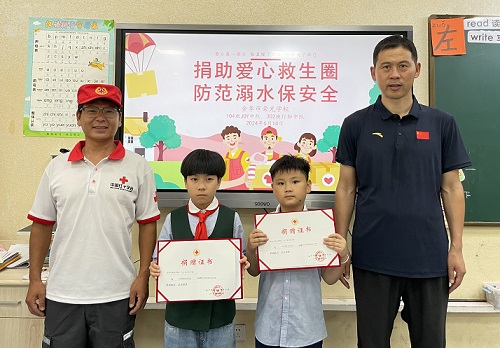 (通讯员 童真莹 申盼路)金华市荣光学校一(4)班和三(2)班全体同学在学校组织的“庆六一·爱心跳蚤市场”活动中以独特创意、齐心合作和热情售卖收获了800余元的爱心义卖款。在周红章副校长的积极沟通和组织下,2024年6月14日下午,金华市婺城区红十字会应急救援队的朱紫阳叔叔为孩子们送来了红彤彤的捐赠证书。这笔充满孩子爱心的捐款将用于采购防溺水装备。