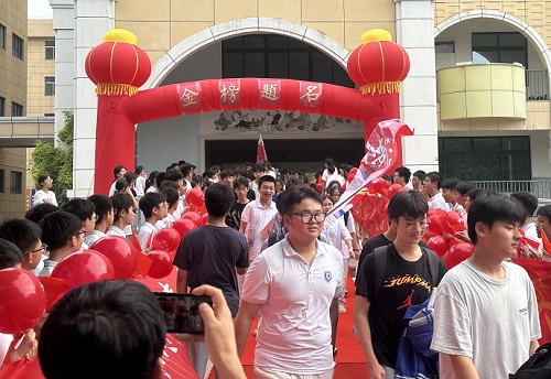 九年级180位学子满脸微笑,宛如出征的将士,精神饱满,斗志昂扬,踏着铿锵有力的步伐,穿过写有“金榜题名”的拱门,走过学弟学妹们夹道欢呼的“状元路”,站在红地毯上和老师们拥抱、击掌。