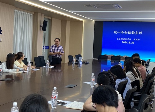 以德润物细无声,潜心从教乐研究。副校长沈建华以《做一个合格的良师》为题,和新老师交流了他的德育心得。沈校长始终秉承“以心育人、以情化人、以德树人”的教育情怀,坚信“师德重于师能,良师重于名师”。他从“做一个有爱心的良师,做一个有底线的良师,做一个安心任教的良师”三个方面阐述了如何做一个良师,其中穿插了一个个充满温情的小故事,使在场的新老师们无不为之动容。最后沈校长以一首诗歌和全体新教师共勉,极大地增强了新教师们的自豪感和自信心,极大地激励新教师教书育人的使命和责任。