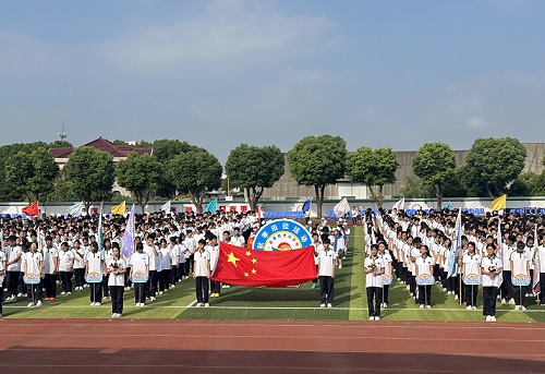 在副校长项亦军的热情主持下,全校师生踏着雄壮的《运动员进行曲》节拍,国旗、会徽、彩旗、鲜花等仪仗队和全校40个班级方队依次入场。