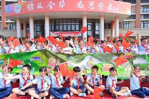 9月29日上午,金华市荣光学校小广场上举行三四年级学生庆祝新中国成立75周年绘画专场——“百米长卷绘祖国”活动。