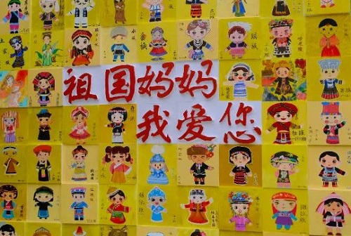 华维文澜小学的观澜广场上,一幅由56个民族人物汇聚而成的巨型作品正在展出。藏族的小朋友穿着长长的袍子,苗族的小朋友戴着闪亮的银饰……不同的服饰,不同的特色,拥有着同一颗爱国之心。这幅由文澜学子共同绘制而成的美丽画作,汇聚成了民族大团结的美好画面。正是“五十六个民族,五十六幅画,五十六个文澜班级绘中华。”