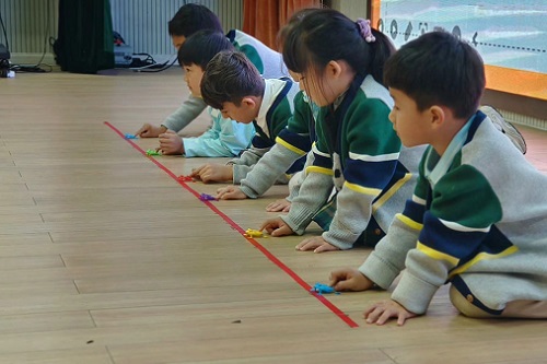 一年级“青蛙三级跳”,每小组随机抽取一名同学参赛。参赛同学在剧院舞台上弯着腰,双眼注视前方,目测距离,手指一按,“嘎达”、“嘎达”、“嘎达”,塑料青蛙首尾相连,连跳三次,谁的距离远,谁胜!有趣的比赛让同学们学会比较和测量。