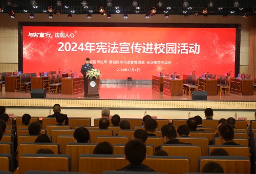 (通讯员 郑湛然 申盼路)为进一步弘扬宪法精神,增强师生遵守宪法意识,维护宪法法律权威,12月4日,在第十一个“国家宪法日”到来之际,金华市婺城区市场监督管理局在金华市荣光学校开展了宪法进校园专题普法宣传活动。金华市市场监管局政策法规处处长戴伟忠、金华市婺城区委组织部副部长舒子剑、婺城区纪委区监委第七派驻纪检监察组副组长章丽华、婺城区司法局党组成员洪玉茹等领导和全校师生代表参加活动。