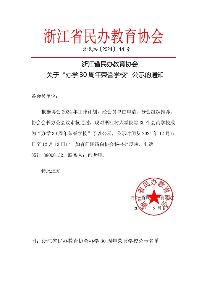 浙江省民办教育协会关于“办学30周年荣誉学校”公示的通知(图)