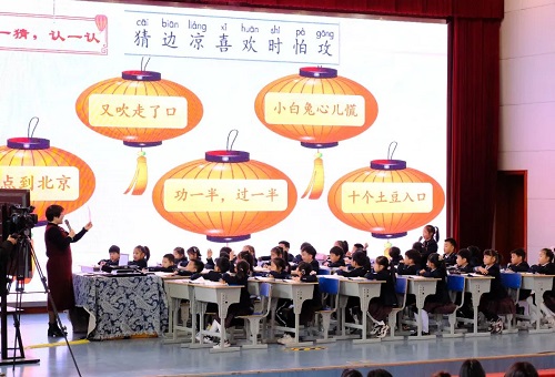 《猜字谜》一课樱桃老师以游戏化的形式让学生趣识汉字,让识字教学“字”得其乐。并巧妙地创设了灯谜大会的大情境,让学生在情境中“认读生字、趣猜字谜、学写生字”,呈现了一堂情境化、生活化、游戏化的语文课。