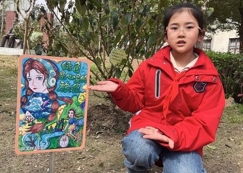 华维文澜小学美术组精选出40件作品,并将其制作成宣传标识牌,安装在校园主要草坪区域。新颖的宣传标识牌吸引孩子们纷纷驻足观看,潜移默化中提高大家爱护校园、保护环境的意识。在教学楼一侧的草坪上,二(4)班的沈雨昕惊喜地发现了自己的作品,“我要带更多同学来看我的‘宣传标识牌’,让大家一起爱护身边的每一片绿。”