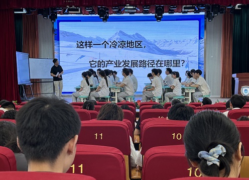 在高二(2)班的《冷凉经济——高地特色产业改变未来》课堂上,浙江义乌外国语学校任巍巍老师以贵州六盘水为研究案例,通过开课一讲、小老师领学、小组合作等环节,将课堂主动权完全交给学生,带领学生探索冷凉经济的现状及区域发展的基本策略和路径。