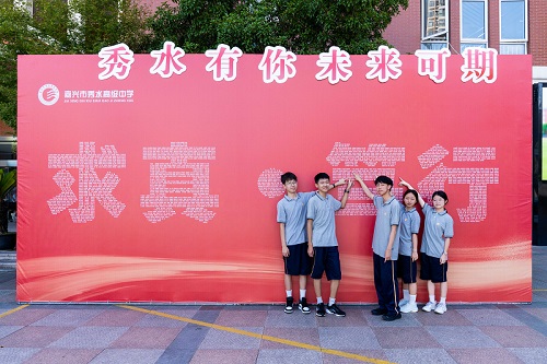行知广场,一面印满全校学生姓名的“校训欢迎墙”格外醒目。墙上“秀水有你,未来可期”八个大字熠熠生辉,与“求真•笃行”校训交相辉映,寓意每位学生都是校园中独特的“星”,在共同的信念下汇聚成照亮未来的“银河”。