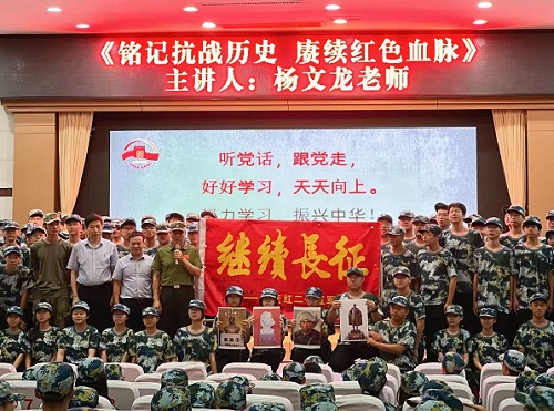 (通讯员 许沙)8月28日晚,温州市全民国防教育协会讲师团走进常务副会长单位——瑞安市龙翔高级中学。协会执行会长、优秀退役军人杨文龙以《铭记抗战历史 赓续红色血脉》为题,接连开讲两堂国防教育课,为该校1800余名师生带来一场浸润心灵的“红色课堂”。