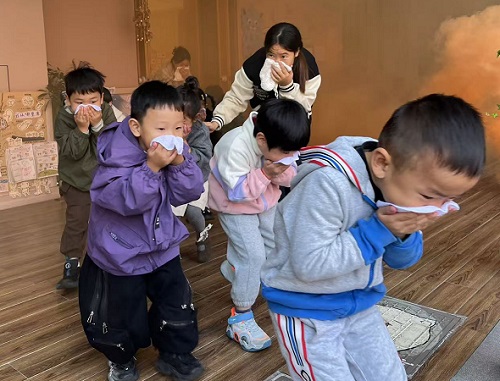 上午10:00,“点火”烟雾四散蔓延,园内立即响起急促的警报声,演练正式开始!所有教职工立即到达指定岗位,指导荣宝快速疏散。