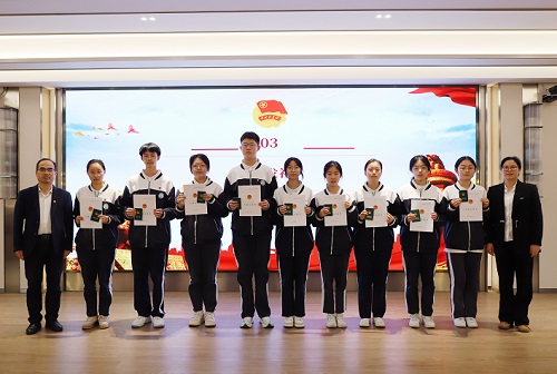 下午15:50,仪式在庄严的国歌声中拉开序幕,全体人员起立,奏唱中华人民共和国国歌。随后,团委书记楼科鑫老师宣布了新团员名单,标志着这批优秀学生正式成为共青团的一员。荣怀学校英才学部党支部代表为新团员们颁发了团员证,并佩戴上象征共青团员身份的团徽。新团员们在团旗的见证下,整齐列队,右手握拳,面向团旗庄严宣誓。他们的誓言铿锵有力,表达了对共青团的忠诚与热爱,彰显了青年学子的责任与担当。