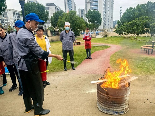 随后,食堂后勤员工也进行了灭火器实操演练。食堂作为校园人员密集且用火用电频繁的重要区域,消防安全至关重要。在专业人员的指导下,后勤员工们认真学习了灭火器的使用方法。从检查灭火器的压力、指针是否在正常范围,到正确的握持姿势、对准火焰根部喷射等操作,员工们一一实践。