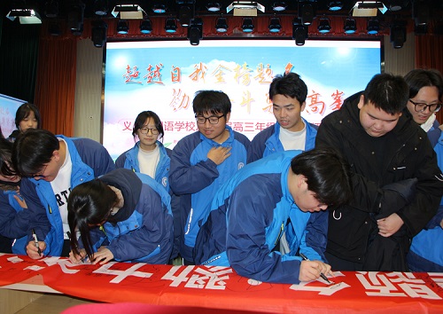 欲戴王冠,必承其重。高考不同情弱者,不相信眼泪。5个高三班师生分别在“超越自我,金榜题名;勠力奋斗,勇攀高峰”鲜红的条幅上郑重签字,表达自己勠力奋斗勇攀高峰的决心,并把条幅挂在了各班教室,以便时刻提醒自己珍惜时间,认真备考。
