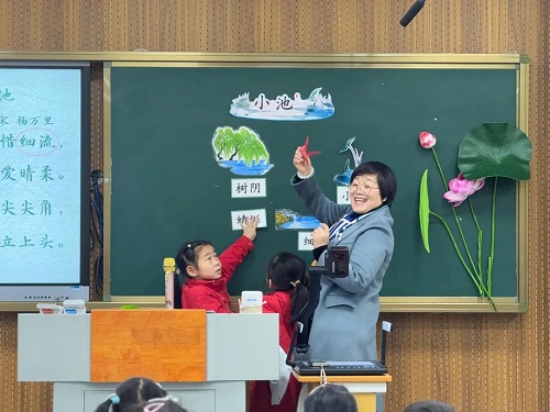刘雅萍老师的课堂不仅有AI赋能,更是满满的童话味,“泉眼无声惜细流,树阴照水爱晴柔”是本堂课的重难点,刘雅萍老师利用童话方式讲述,让学生明白泉眼、树阴皆有情感。学生们为评选出形象大使积极在诗中寻找景物,张贴在黑板上,图文结合的形式让古诗呈现得更有趣味性,孩子们沉浸在童话世界。