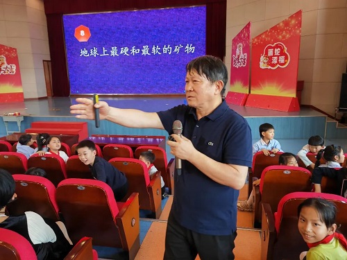胡教授从“岩石和矿物的区别有什么区别”出发,介绍了矿物的知识。同学们不仅知道了最硬、最软的矿物,还看到了颜色、形状各不相同的矿物,赤铁矿、磁铁矿、石墨、金刚石轮番上场,活动现场时有“哇”声一片:看到恐龙化石图片时,孩子们惊叹;看到火山爆发形成岛屿视频时,孩子们惊奇;看到数量庞大的企鹅摇摇摆摆走来时,孩子们惊呼;看到各处自然风光时,孩子们又深深地陶醉其中,感叹大自然的鬼斧神工……