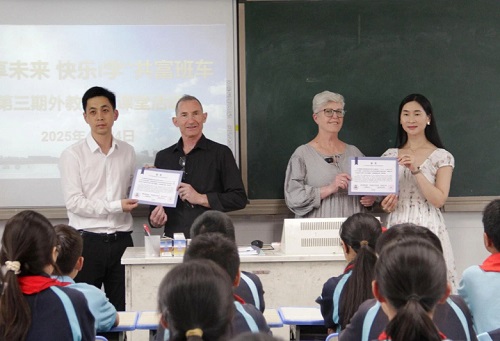 阜溪街道党工委书记郑滔和湖州求是教育集团副董事长、民盟德清支部副主委沈春燕分别授予外教老师Tracee和David支教证书。
