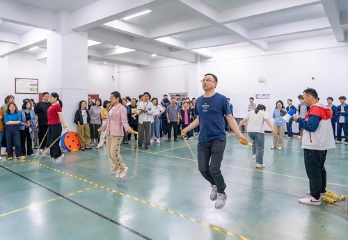 单人跳绳区俨然成为个人技艺的展演台。随着裁判哨声响起,参赛教师双手快速摇动跳绳,单脚跳、交替跳等花样频出。这一刻,三尺讲台上的严谨化作腾空的轻盈,教科书里的公式化作脚下韵律的节拍。绳影翻飞间,教育者们轻盈跃动的身姿与课堂上的沉稳形成鲜明对比,展现了对生活的热爱与激情。沈叶亚老师足尖轻点,彩绳化作环绕周身的流光,以1分钟236次的成绩摘得桂冠。课堂上是解题高手,赛场上亦是跳绳达人。
