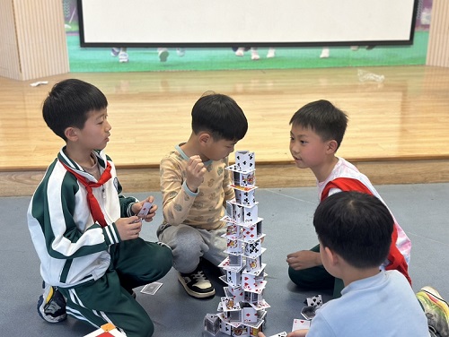 纸杯叠叠高和纸牌叠高比赛现场气氛热烈。同学们全神贯注,小心翼翼地将纸杯和纸牌一层层堆叠起来。这不仅考验了他们的动手能力,还需要他们运用数学和物理知识,寻找最稳定的搭建方法。在比赛过程中,有的同学的作品在即将完成时突然倒塌,但他们没有气馁,而是迅速调整心态,重新开始。最终,那些成功搭建出又高又稳作品的同学赢得了阵阵掌声。