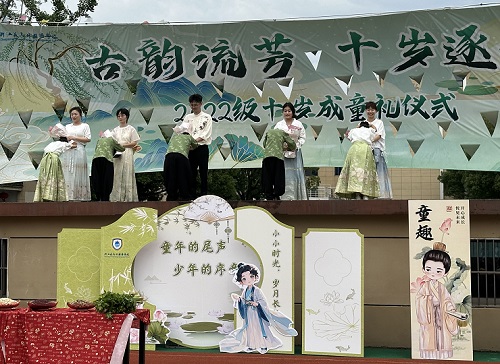 校园操场,彩旗飘扬,“古韵流芳,十岁逐光”的横幅在微风中猎猎作响。孩子们身着典雅的传统服饰,宛如古代的学童,在老师和家长温柔目光的注视下,迈着坚定又略带稚嫩的步伐,依次走过“文枢门”,寓意着孩子们正式进入新的人生阶段,自此将立志向学,开启知识探索与品格塑造的新旅程。