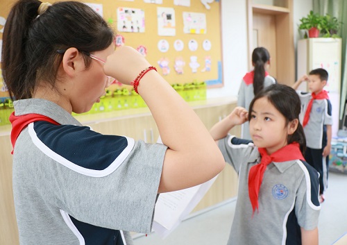 “你知道少先队的全称吗?”“红领巾怎么系”?“你能唱队歌吗?”在入队考核现场,一年级的小同学们手持“闯关卡”,依次通过“六知六会”考核关卡。老师们和高年级的少先队代表担任“考官”,耐心引导孩子们回答少先队基础知识,并指导他们正确佩戴红领巾、敬队礼、呼号等。
